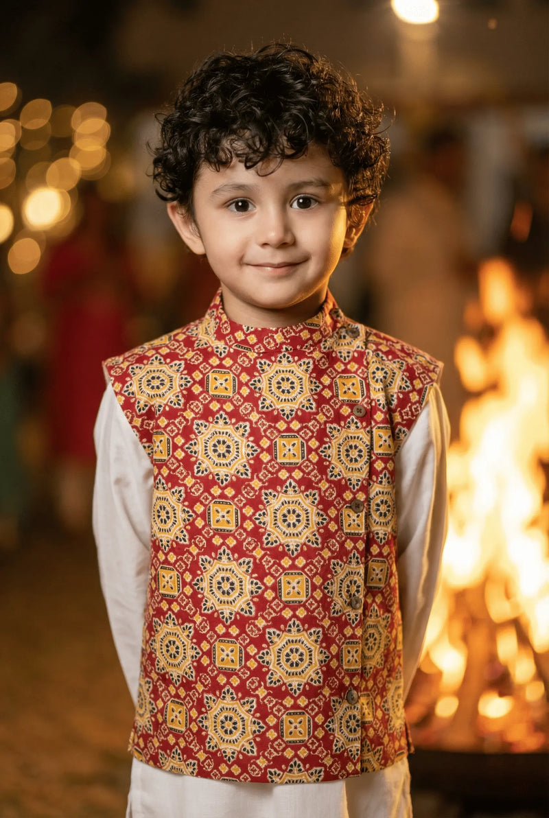 Make your little one the best-dressed boy at every festive gathering with the Bebe Unicorn Boys 3-Piece Nehru Jacket Kurta Pyjama Set — a stunning red geometric mandala print Nehru jacket paired with a cream full-sleeve kurta and matching white pyjama, made for boys aged 2 to 8 years. The bold red jacket features an intricate patola-inspired geometric mandala print in gold and white — giving it a regal, traditional feel that stands out at every celebration. Whether it's Diwali, Lohri, a wedding, a naming ceremony, Navratri or any family puja — this 3-piece set makes every moment memorable.