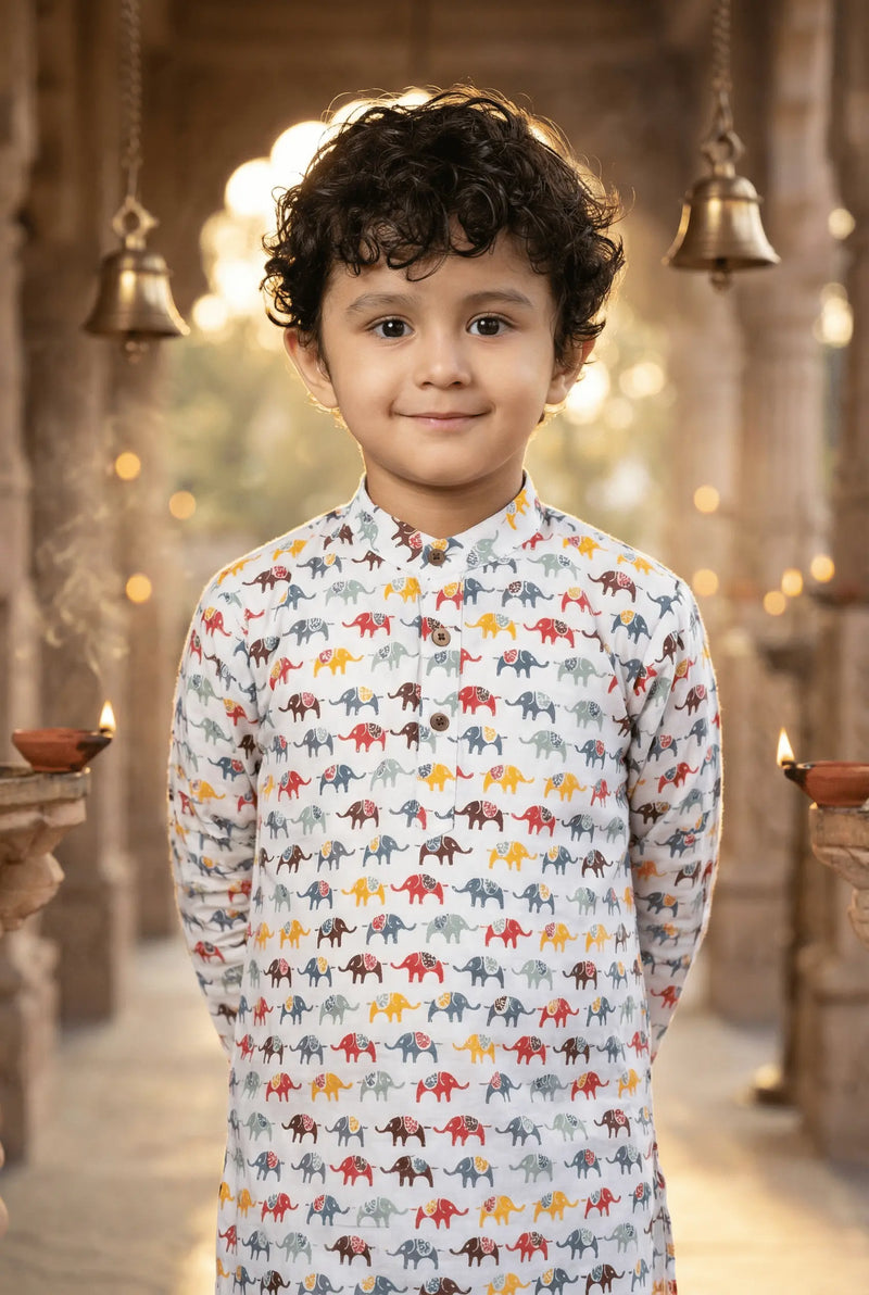 Dress your little one in style with this vibrant Kids Dress for Boys, perfect for Diwali celebrations. This elegant ethnic wear for 4-year-old boys features a beautifully designed kurta with colorful elephant patterns, paired with comfortable white churidar and matching jutti shoes. Crafted from high-quality fabric, this Diwali ethnic wear ensures comfort and a festive look for your child. Ideal for family gatherings, parties, or festive occasions, this outfit is a must-have in your wardrobe.