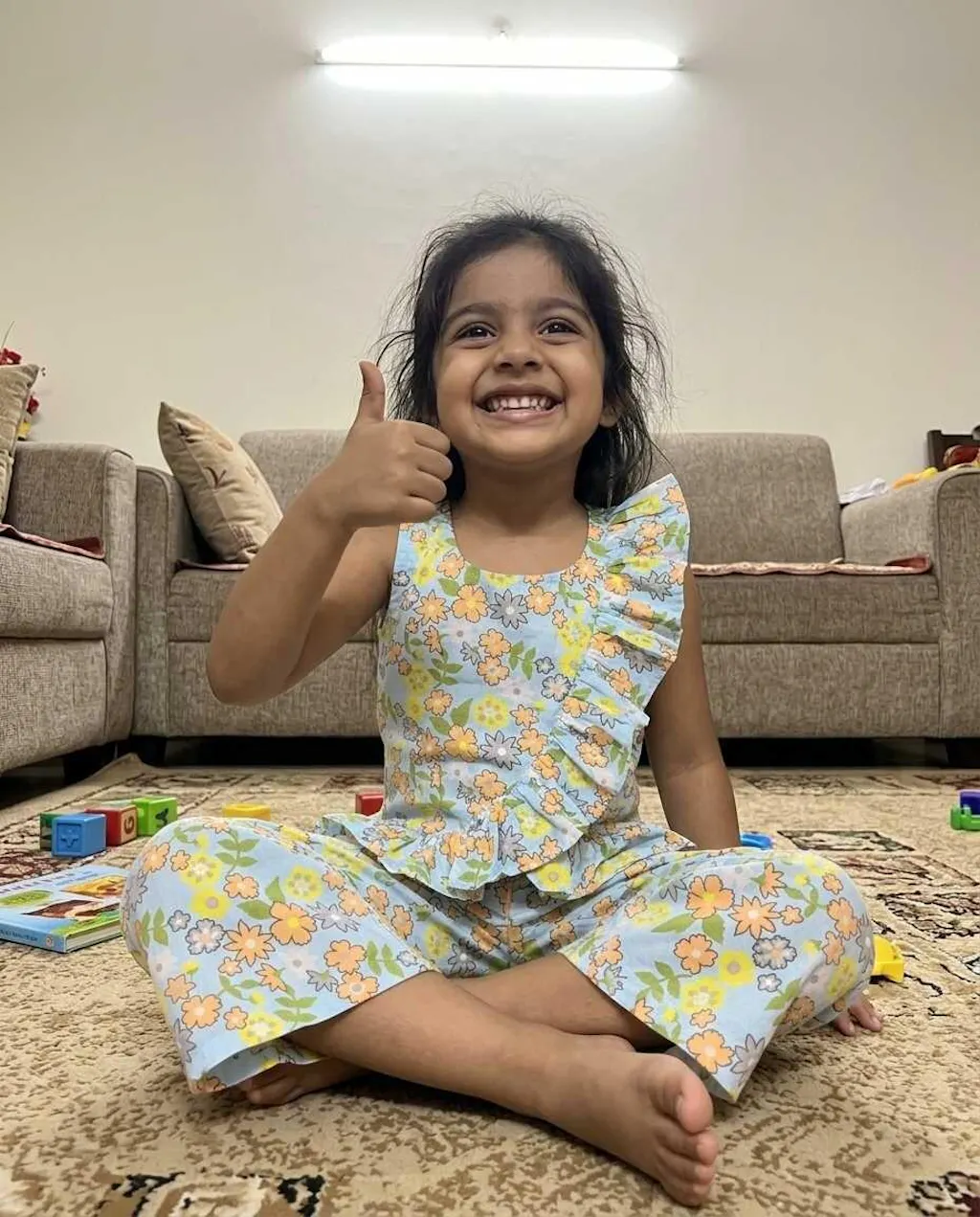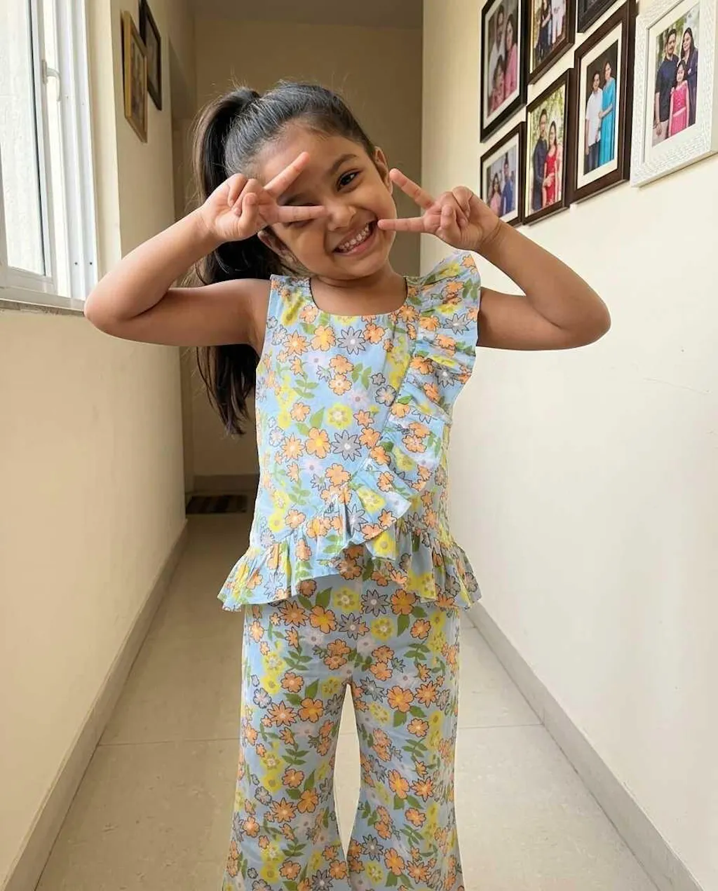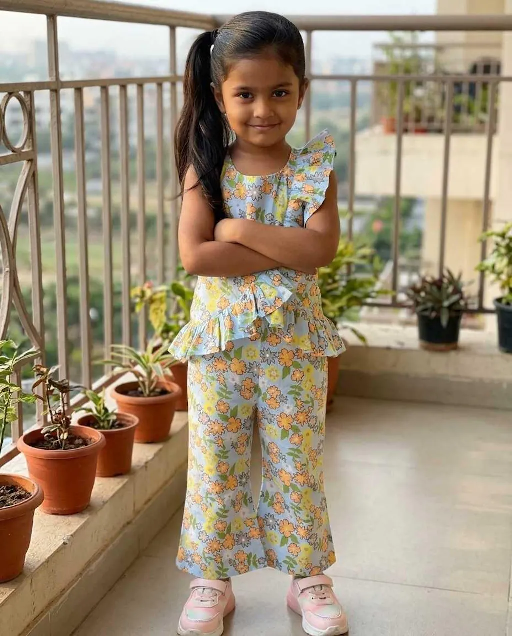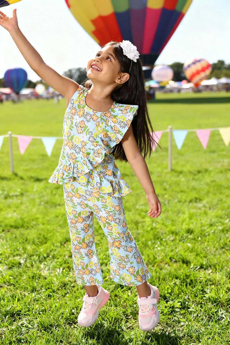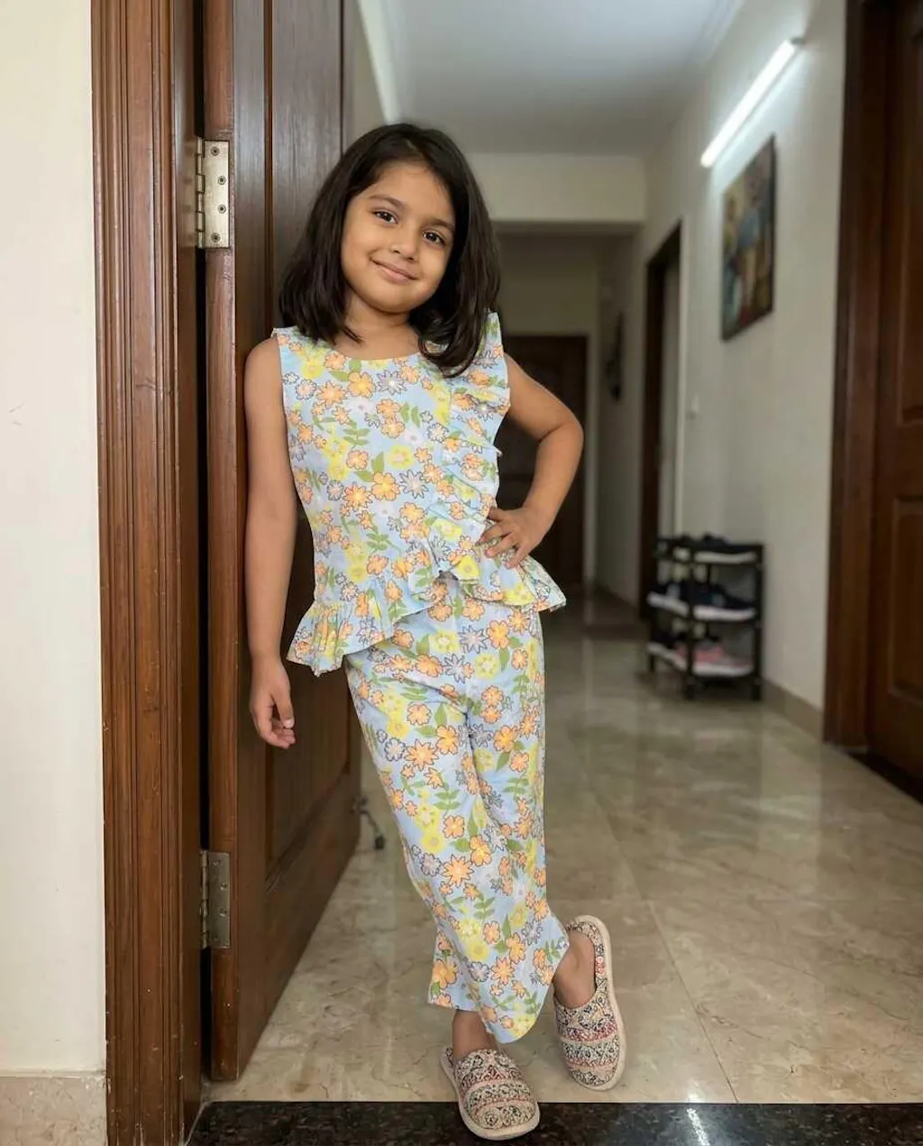 Introduce your little girl to her new favourite outfit with the Bebe Unicorn Girls Sky Blue Floral Ruffle Coord Set — a stunning sky blue summer floral peplum top with a bold double ruffle front panel, paired with matching straight pants, crafted for girls aged 2 to 8 years. The cheerful orange, yellow and green florals bloom across a fresh powder blue base — bright, summery and full of life. But it's the dramatic double ruffle running down the front of the top that makes this coord set truly special — a show-stopping detail that turns heads at every birthday party, family outing and festive occasion.